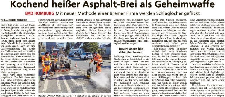 Schlaglochreparatur geht auch mit hoher Qualität durch den Einsatz von Warmmischgut. Ein Praxisbeispiel mit dem Mobile Pave Repair System (MPRS). Die Kreisstraßenmeisterei Hörlitz ist für ca. 215 km Straßennetz im Landkreis Oberspreewald-Lausitz im Süden Brandenburgs verantwortlich. Die Belegschaft arbeitet täglich mit Hochdruck daran die Verkehrsflächen in einem guten baulichen und betrieblichen Zustand zu halten …… weiterlesen im Download PDF [602 KB] >>